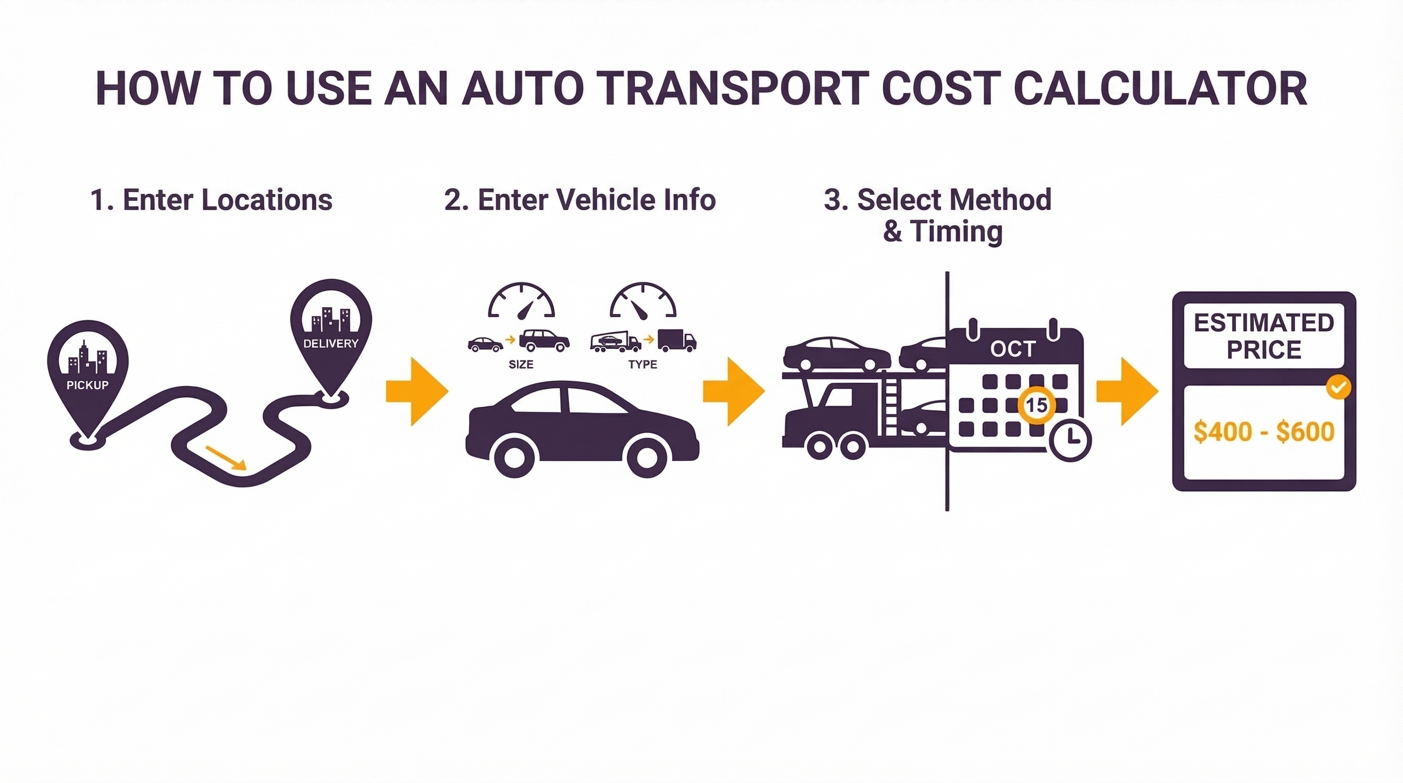 Finally, you select the transport method and preferred pickup timeframe. Once these details are submitted, the car transport calculator generates an estimated price range that reflects typical market conditions.