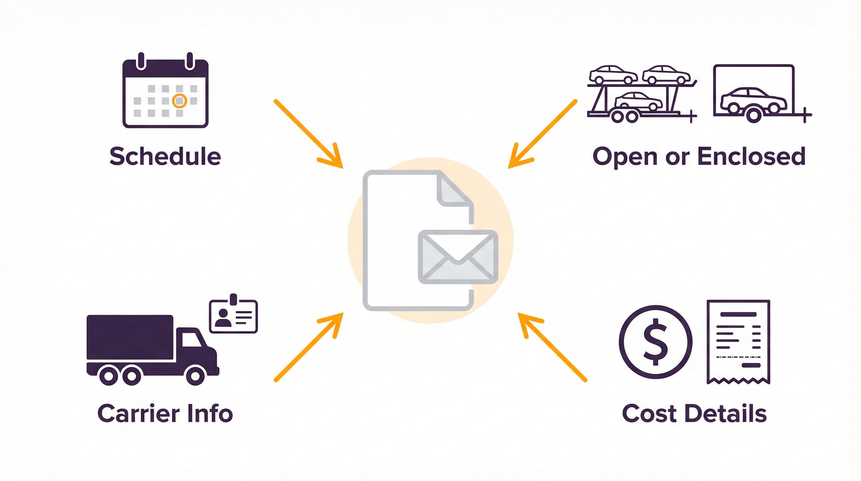 The confirmation will include the pickup and delivery dates. It also details the type of transport selected, whether open or enclosed. Reviewing this information ensures everything is as planned.